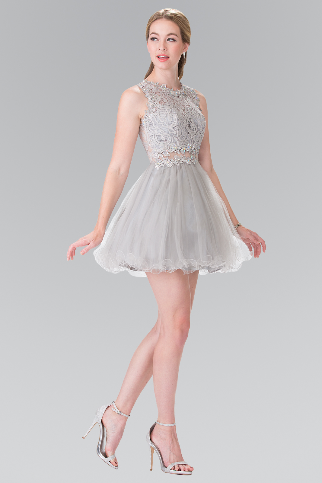 Sleeveless Short Dress with Lace Bodice and Sheer Waistline