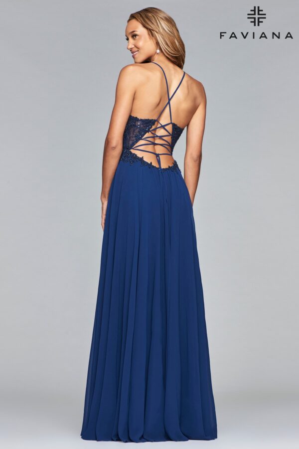 Faviana style 10005 is simplistic, sleek, and fabulous. This long dress features a v-neck, high slit, and unique lace up back detail. This flowy chiffon dress is available in three colors