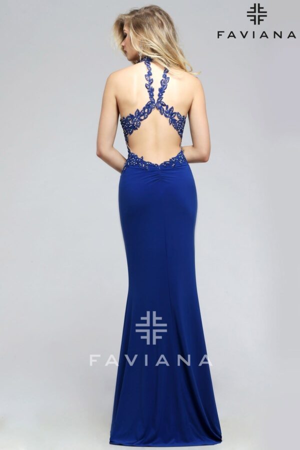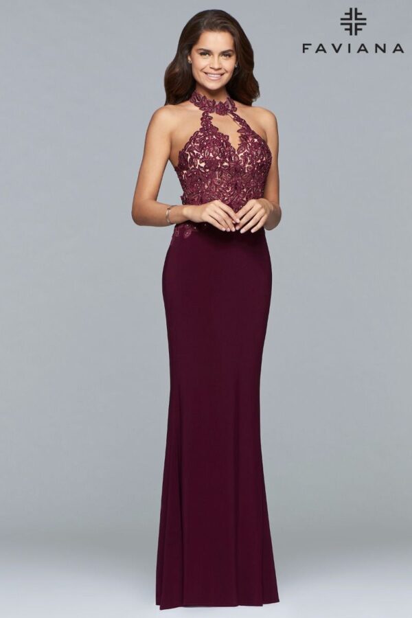 Faviana style 7750 features beautiful lace applique. This jersey halter dress alludes to femininity through its architecturally placed lace. The embellishments are alluring enough to make a statement