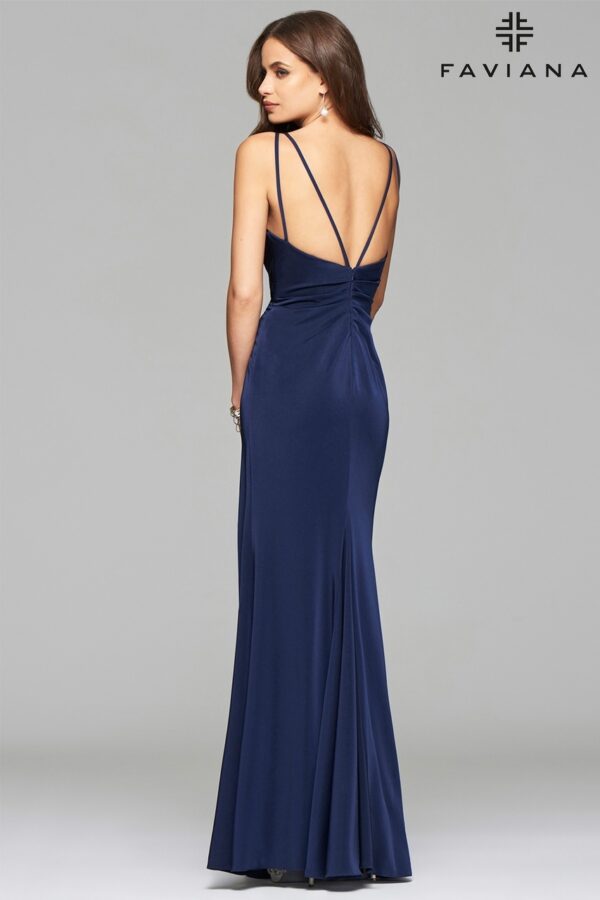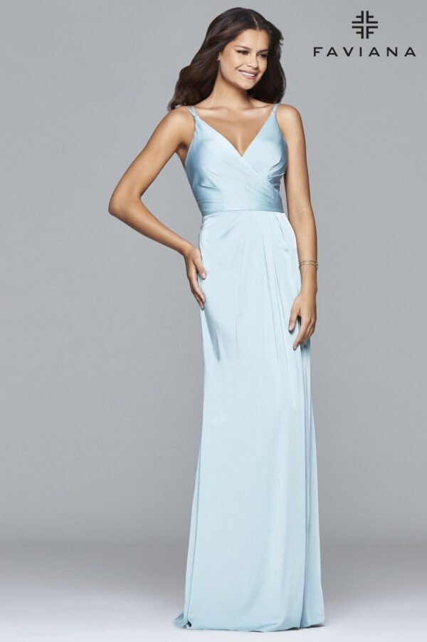 Faviana style 7755 is simplistic, yet classic. This faille satin dress features a v-neck with just the right amount of plunge. The draped front adds texture to the long skirt, while the high slit reveals just the right amount of skin. The back is adorned with thin straps and ruching that are architecturally placed to flatter your figure.