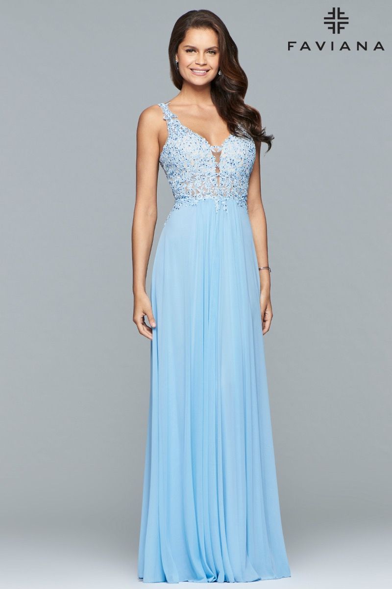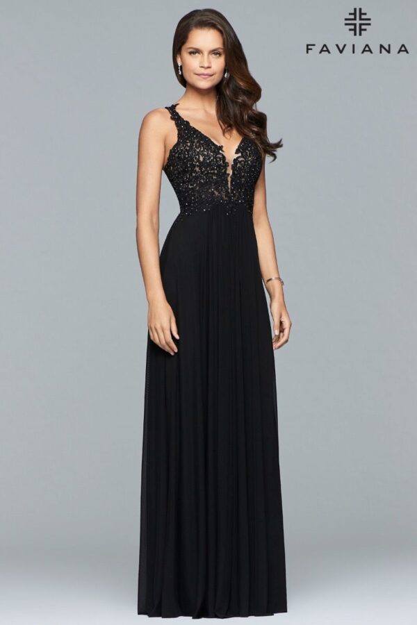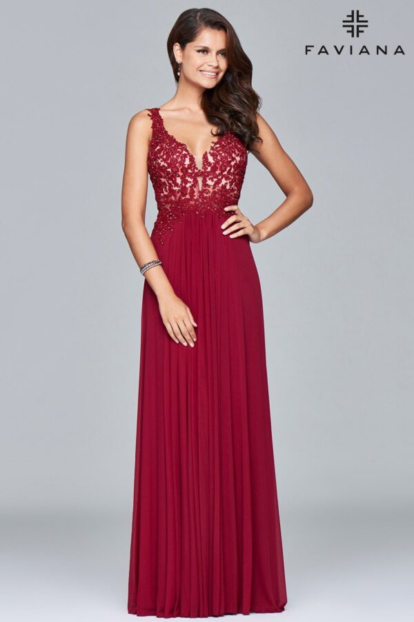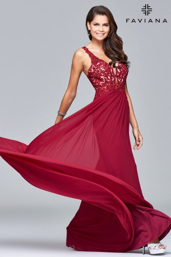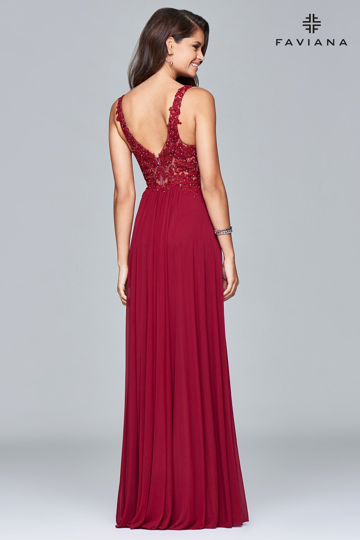 Faviana style 8000 is a sophisticated show stopper. The dress features an elegant v-neck and pleated skirt to welcome all figures. This style is made of mesh fabric and is available in merlot and navy. Pair with pearl earrings and a simple silver cuff bracelet. This flattering dress is perfect as a fall bridesmaid dress and is great for prom.