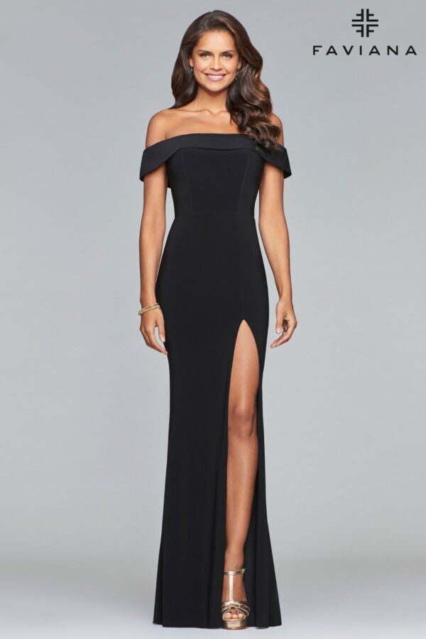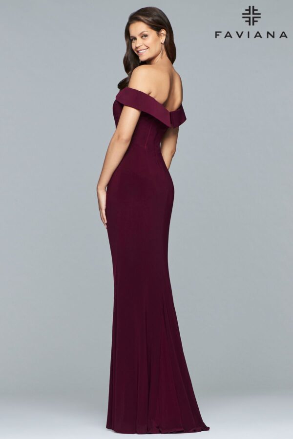 Faviana style S10015 is classic and elegant. This off the shoulder dress features a high slit and is form fitting. This beautiful jersey dress is available in three colors, black, bordeaux, and deep violet. Pair this with crystal jewelry with silver accents and a high ponytail. Look sophisticated at a wedding or black tie event in this dress.
