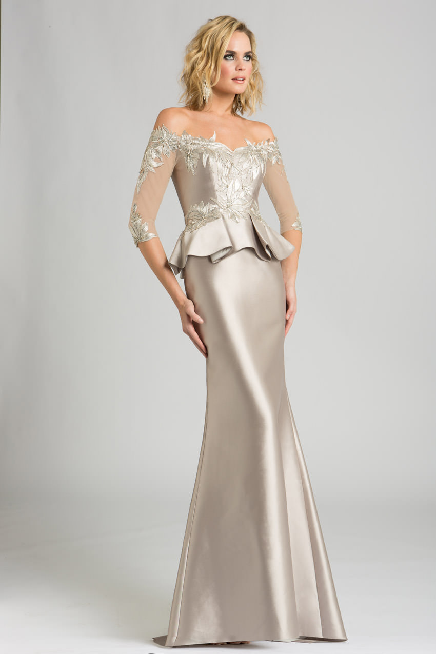 A dazzling motif covers the peplum top of this brilliant gown by Feriani 18574. Off the shoulder neckline leads to sheer, three quarter length sleeves which also feature the decorative motif. The sheen of the full length skirt offers a smooth contrast below.