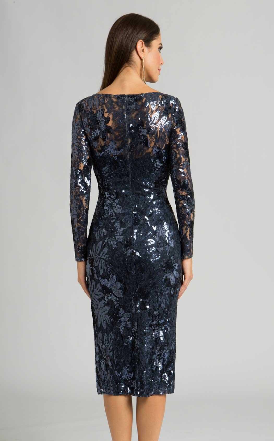 A portrait neckline, a shimmering design decorates your evening look on this glamorous cocktail dress by Feriani 18613. Long sleeves make this design appropriate for multiple seasons.