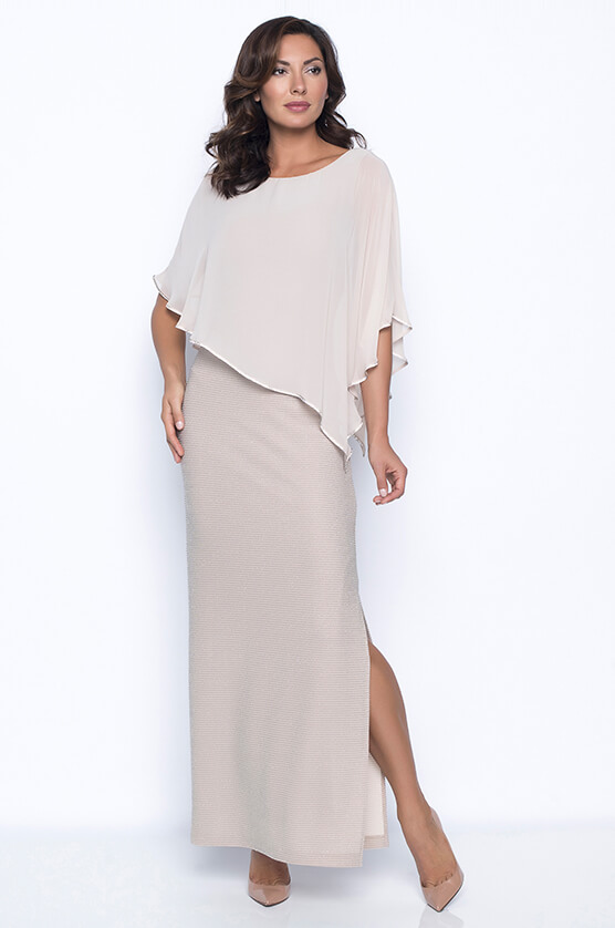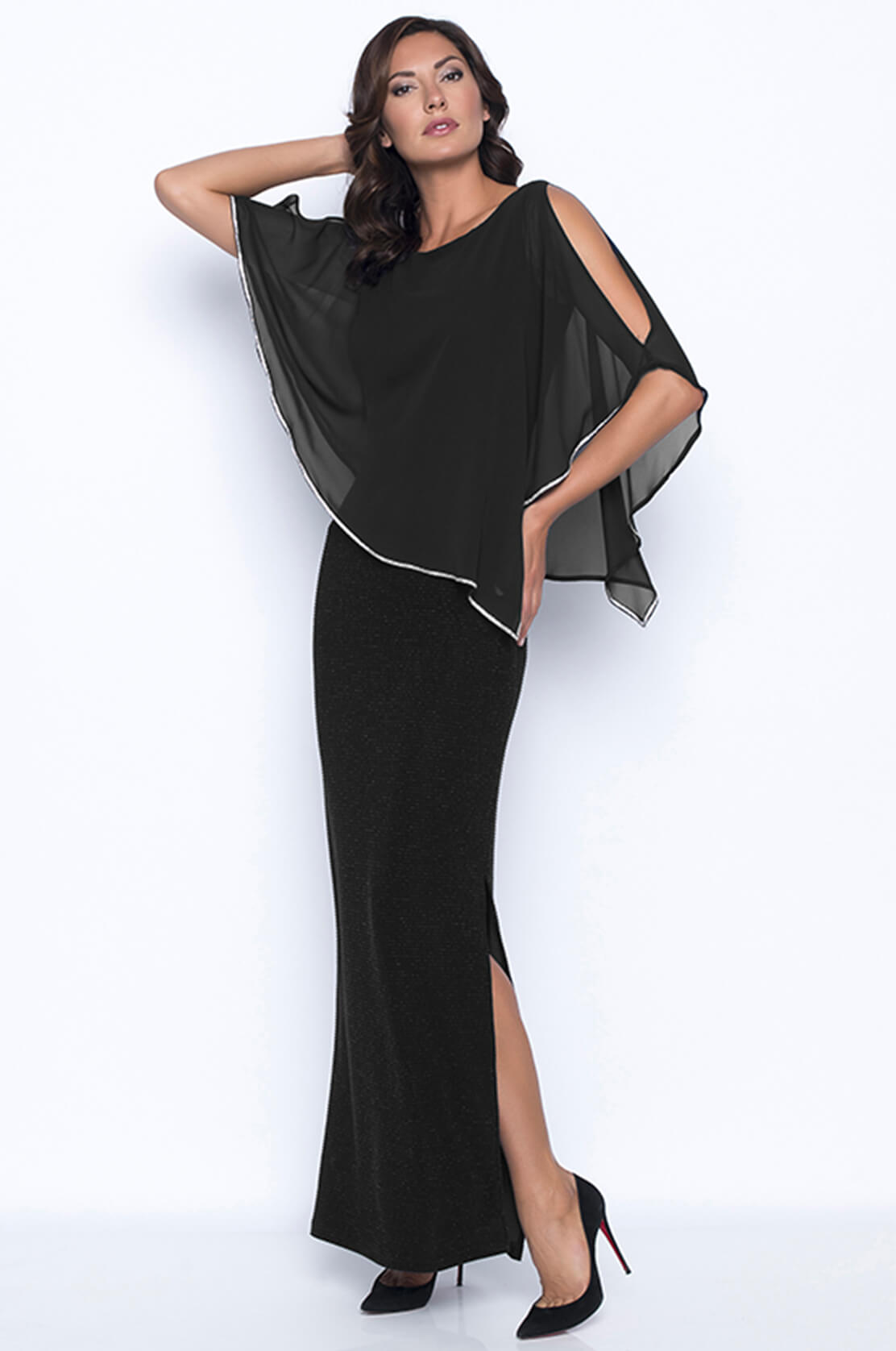 Dress with lurex ottoman at the skirt and sheer overlay trimmed with rhinestones. The overlay gives the dress a fluid flowy look.