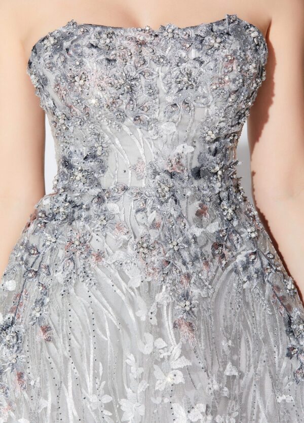 An embellished allover lace and beaded strapless ballgown with a softly curved neckline. Colored lace and beading decorate the bodice and offers a natural waistline, full skirt with horsehair hemline and sweep train. Matching tulle shawl with lace trim included.
