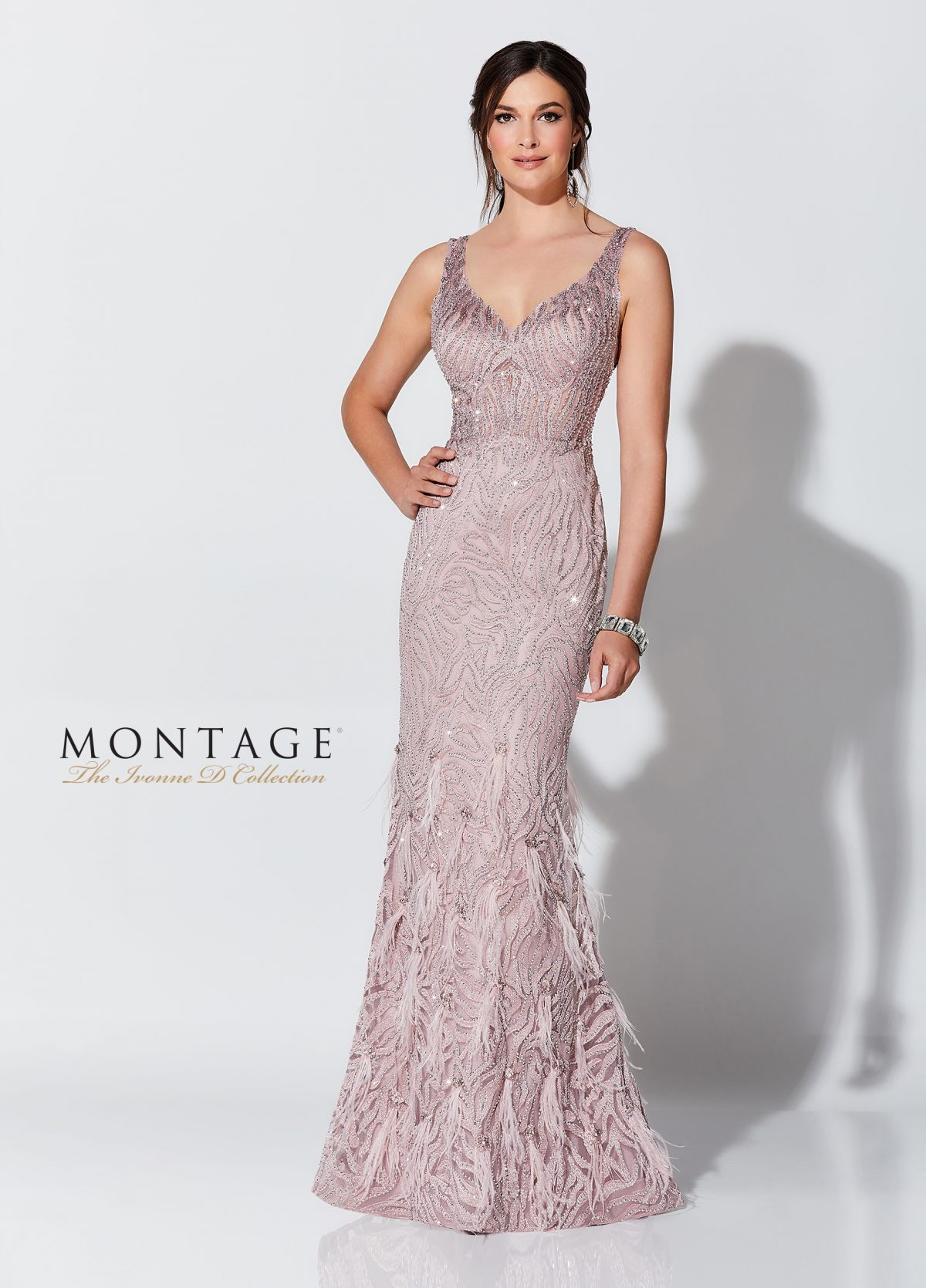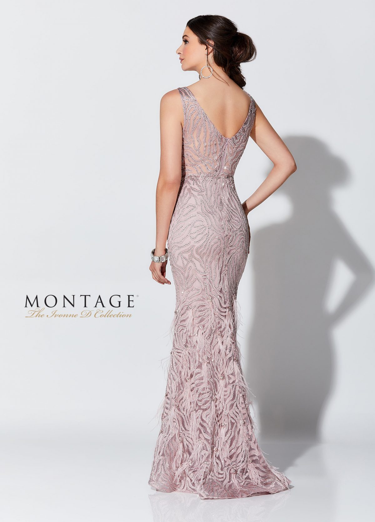 Sleeveless tulle and embroidered trumpet gown with v-neckline and back. An embroidered illusion bodice, the slimming natural waistline and stone accents embellish a flared skirt decorated with soft feathers, horsehair hemline, and sweep train. Separate bodice lining and matching tulle shawl with trimmed lace and feathers included.