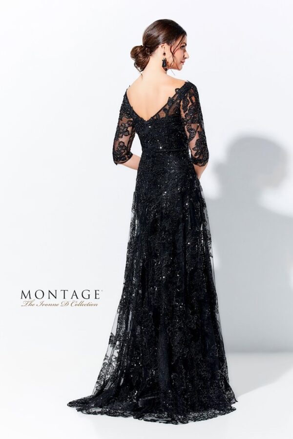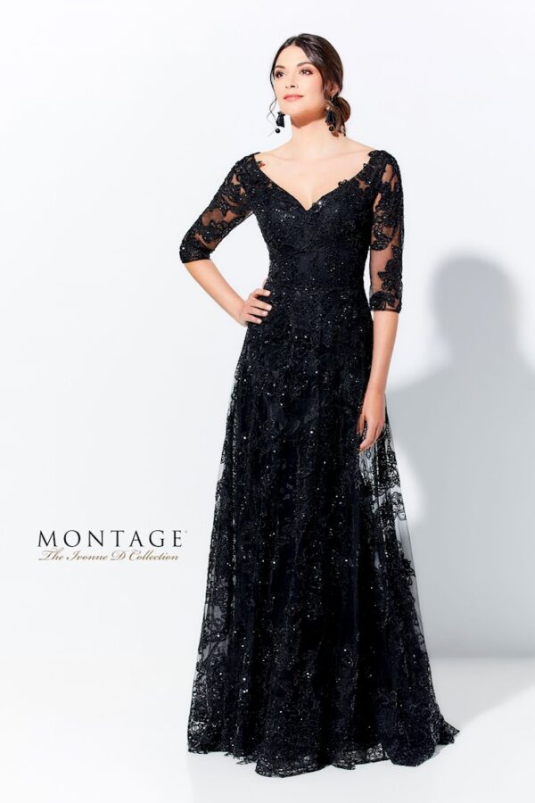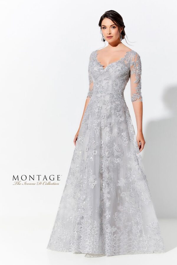Three-quarter length sleeve lace over novelty organza gown, illusion V-neckline and back, natural waistline, sequin and stone accents decorate the bodice and A-line skirt, sweep train.