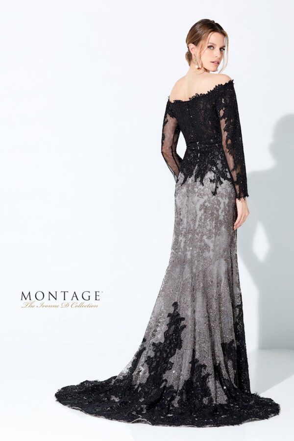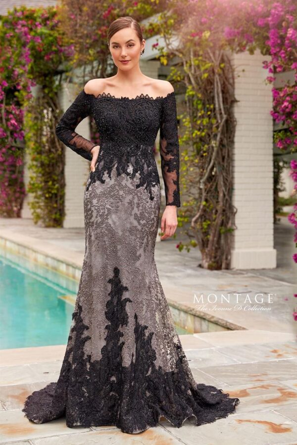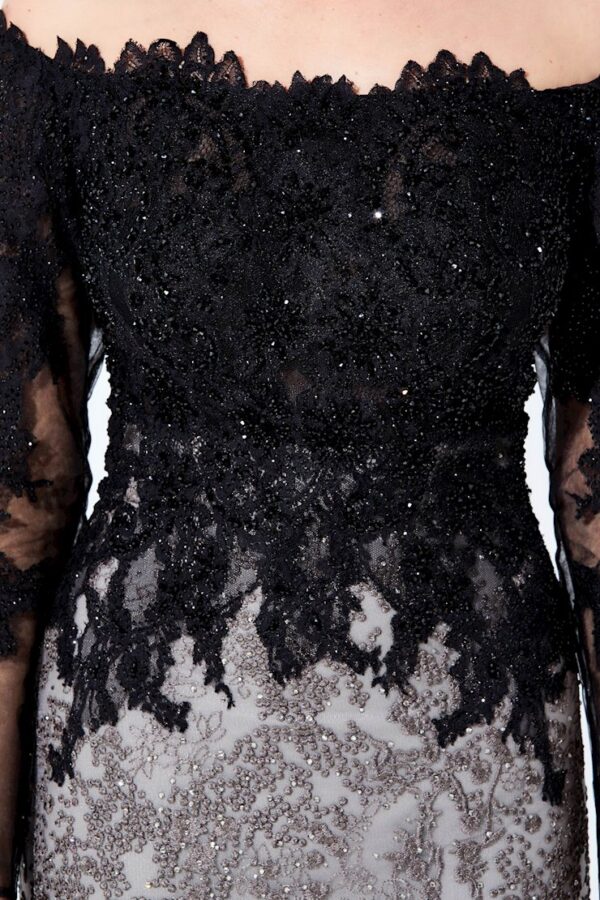 Off the shoulder novelty embroidery fit and flare gown with a straight neckline, long lace sleeves, natural waist, high back, sweep train and stone accents throughout.