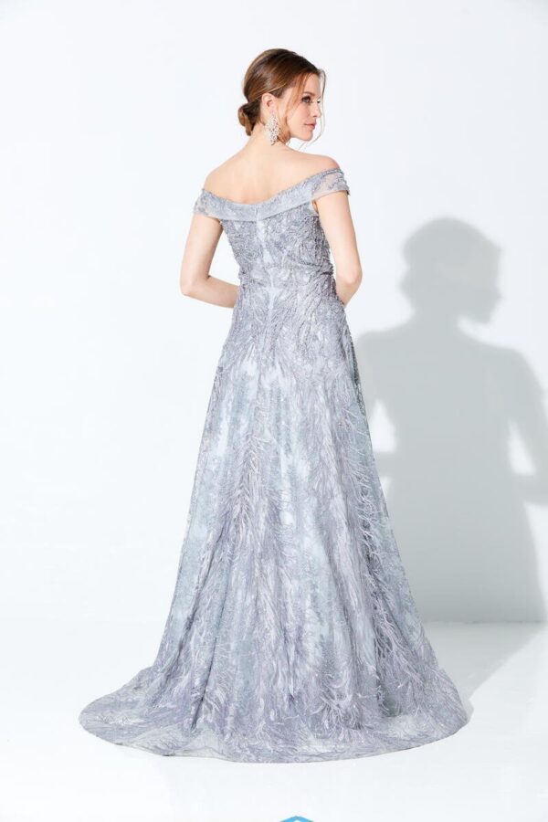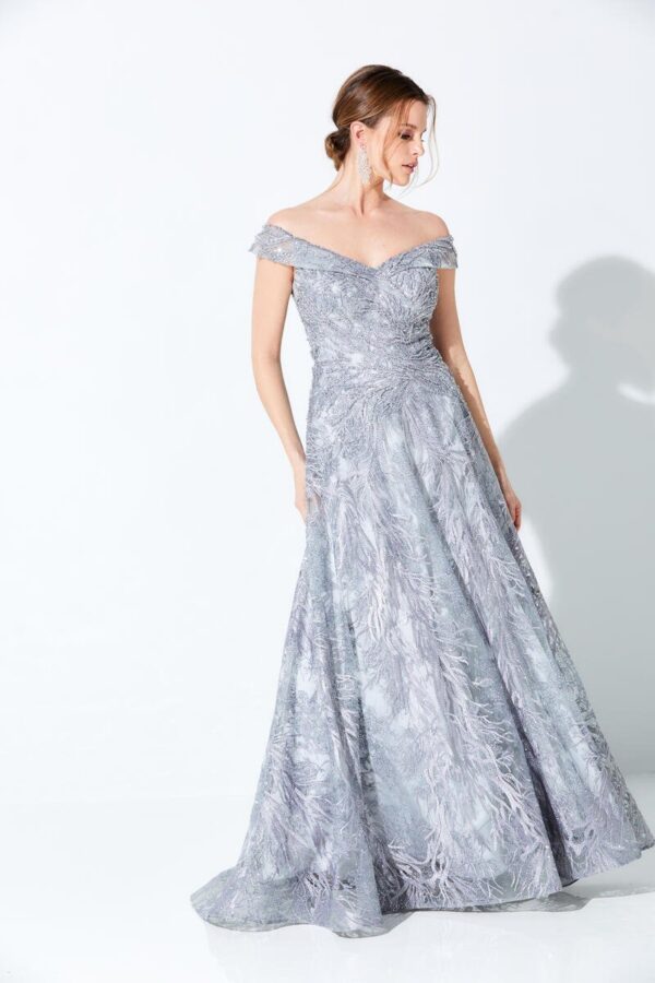 Off the shoulder embroidered tulle a-line gown with a slight v-neck, beaded bodice, natural waist, high zipper back, sweep train and stone accents throughout. Shawl Included