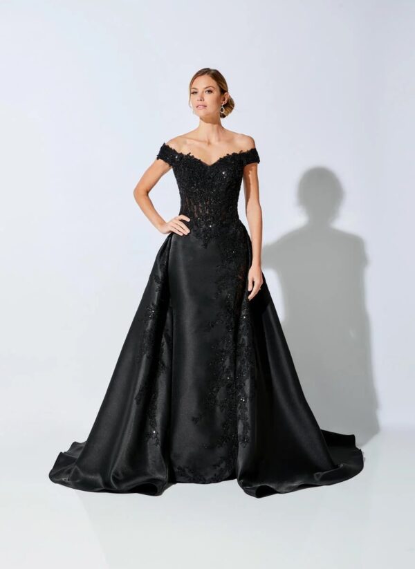 NECKLINE: V-Neck, SILHOUETTE: A-Line, FABRIC: Lace, Mikado, Stone Accents, SPECIAL FEATURES: Detachable Overskirt Included, Shawl Included, Slit Modesty Piece Included, SLEEVE TYPE: Off the Shoulder, WAISTLINE: Dropped Waist