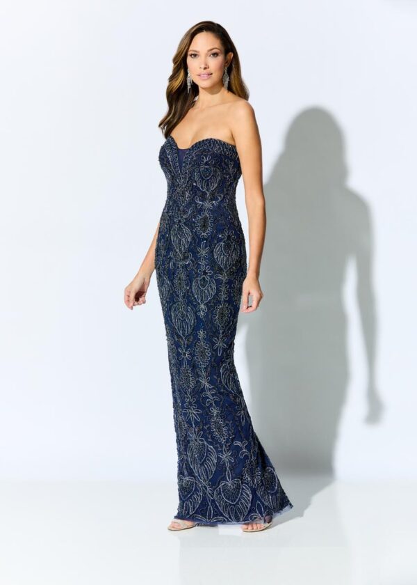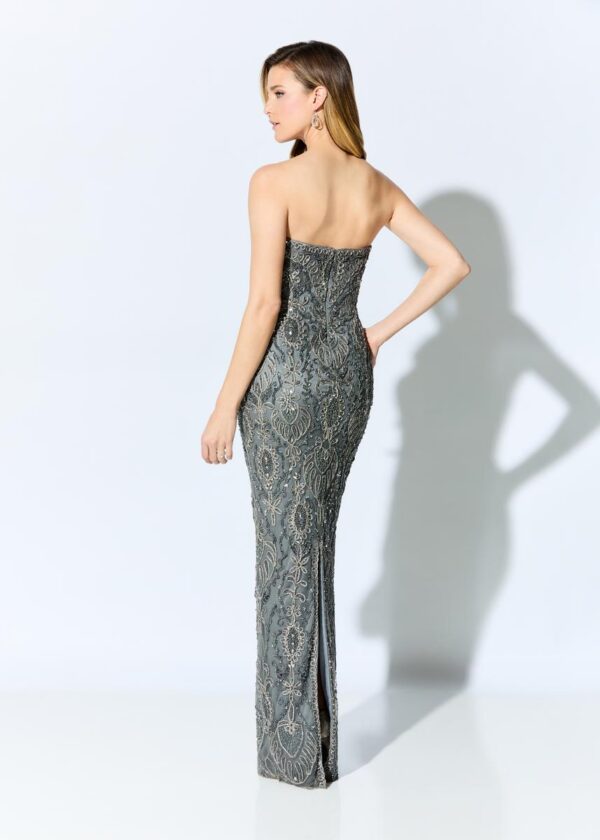 The fabric in this Ivonne D for Mon Cheri style is Shawl, Removable Sheer Tapered Straps & Separate Sleeves Included