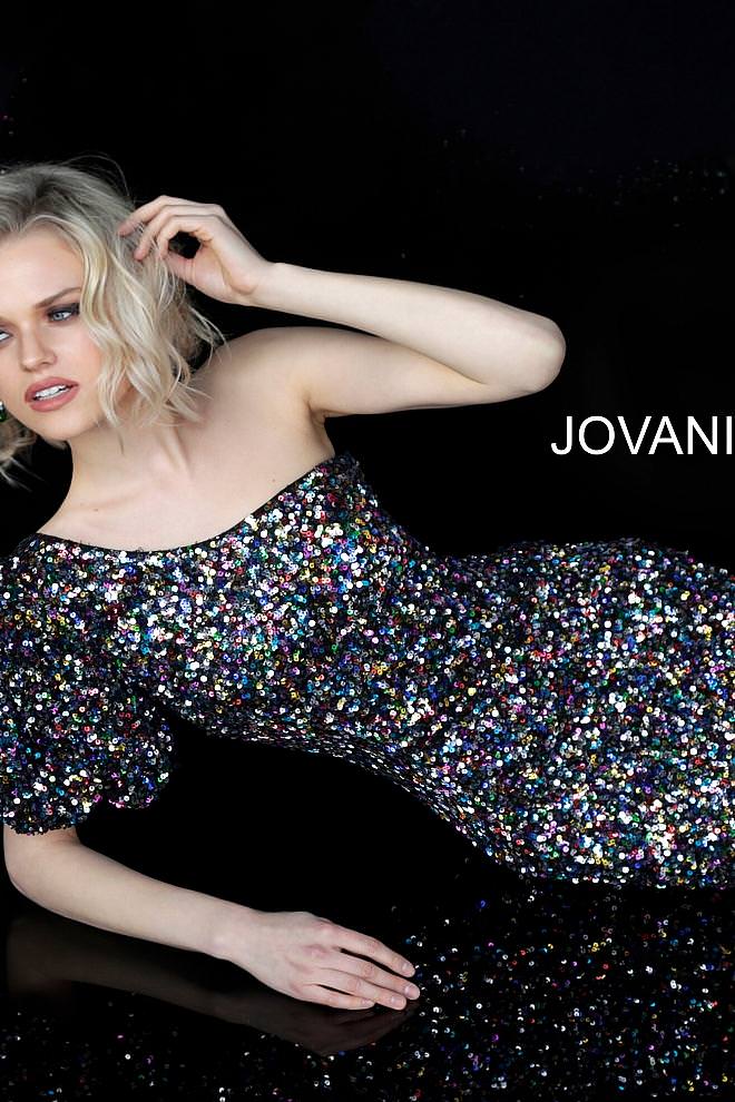 Jovani 1898 one shoulder sleeve short multi sequin cocktail dress