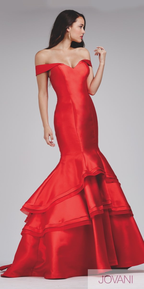 Jovani 31100 Prom Dress Off-the-Shoulder Tiered Trumpet Skirt