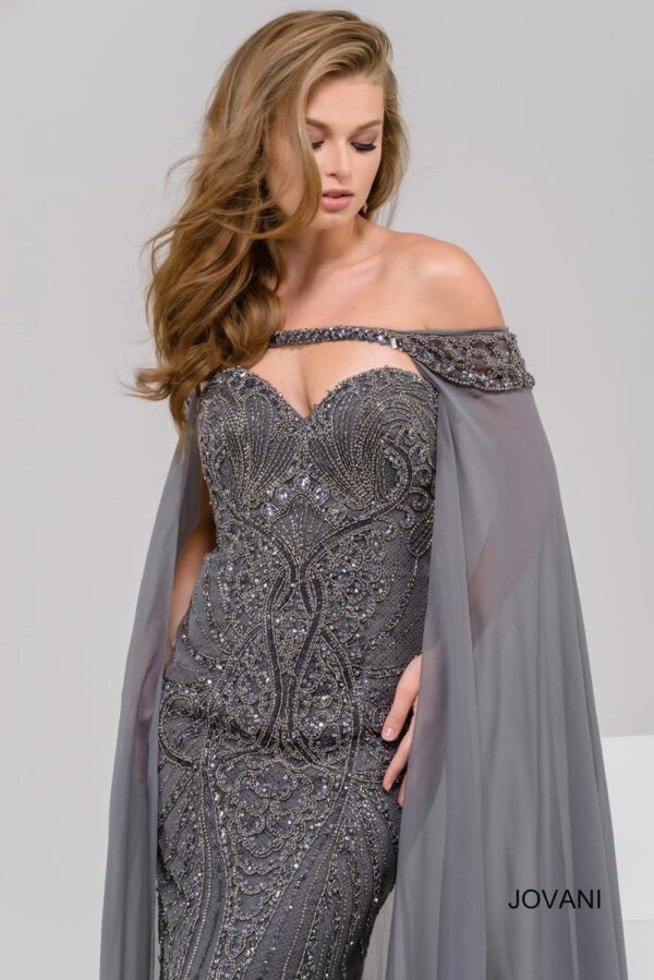 Jovani 45566 Charcoal off the Shoulder Beaded Sweetheart Neck Dress