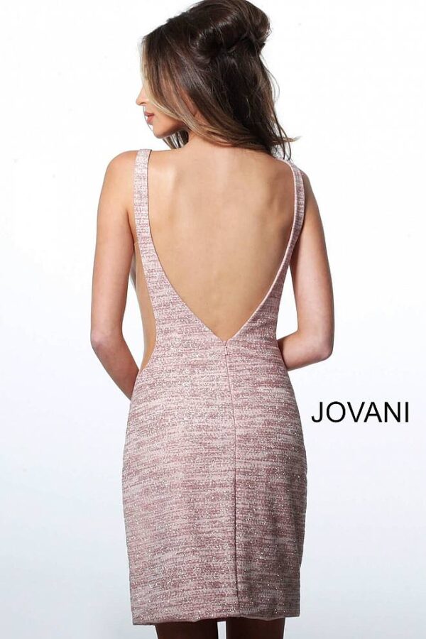 Details: Stretch glitter fabric, fitted short dress, sleeveless bodice, plunging neckline with sheer mesh insert for support, sheer side inserts, V back.