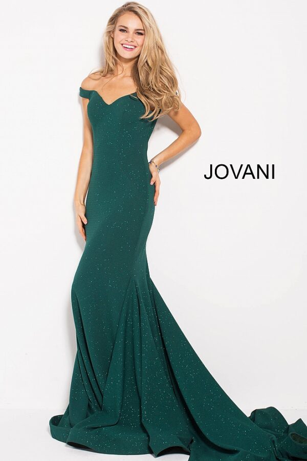 Stretch glitter waffle fabric, off the shoulder sweetheart neckline, floor length with train, horse hair trim, form fitting silhouette.