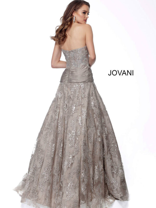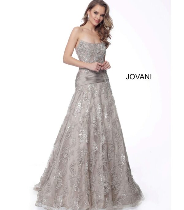 Embroidered fabric, A line floor length skirt, wide pleated belt at drop waist, embellished fitted bodice with boning, strapless scoop neckline with V points.