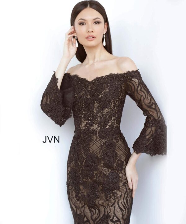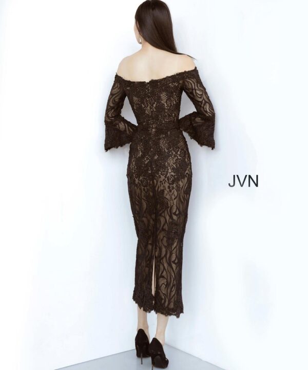 JVN2241 Black Off the Shoulder Tea Length Lace Evening Dress