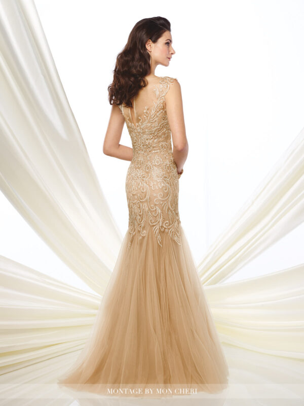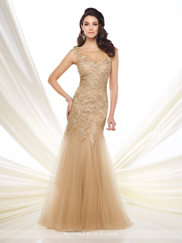 Metallic lace and tulle trumpet gown with slight cap sleeves, illusion bateau neckline, lace sweetheart bodice with dropped waist, illusion keyhole back, gathered soft tulle skirt with sweep train. Matching shawl included.