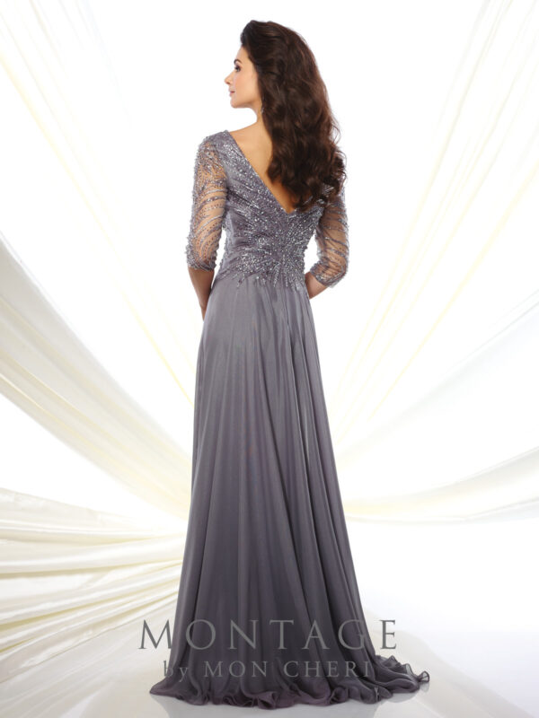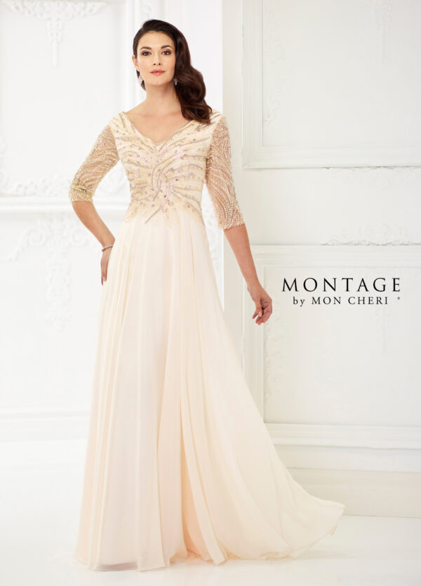 Diamond chiffon A-line gown with hand-beaded three-quarter length sleeves, front and back V-necklines, bodice encrusted with beading, flyaway skirt with sweep train.