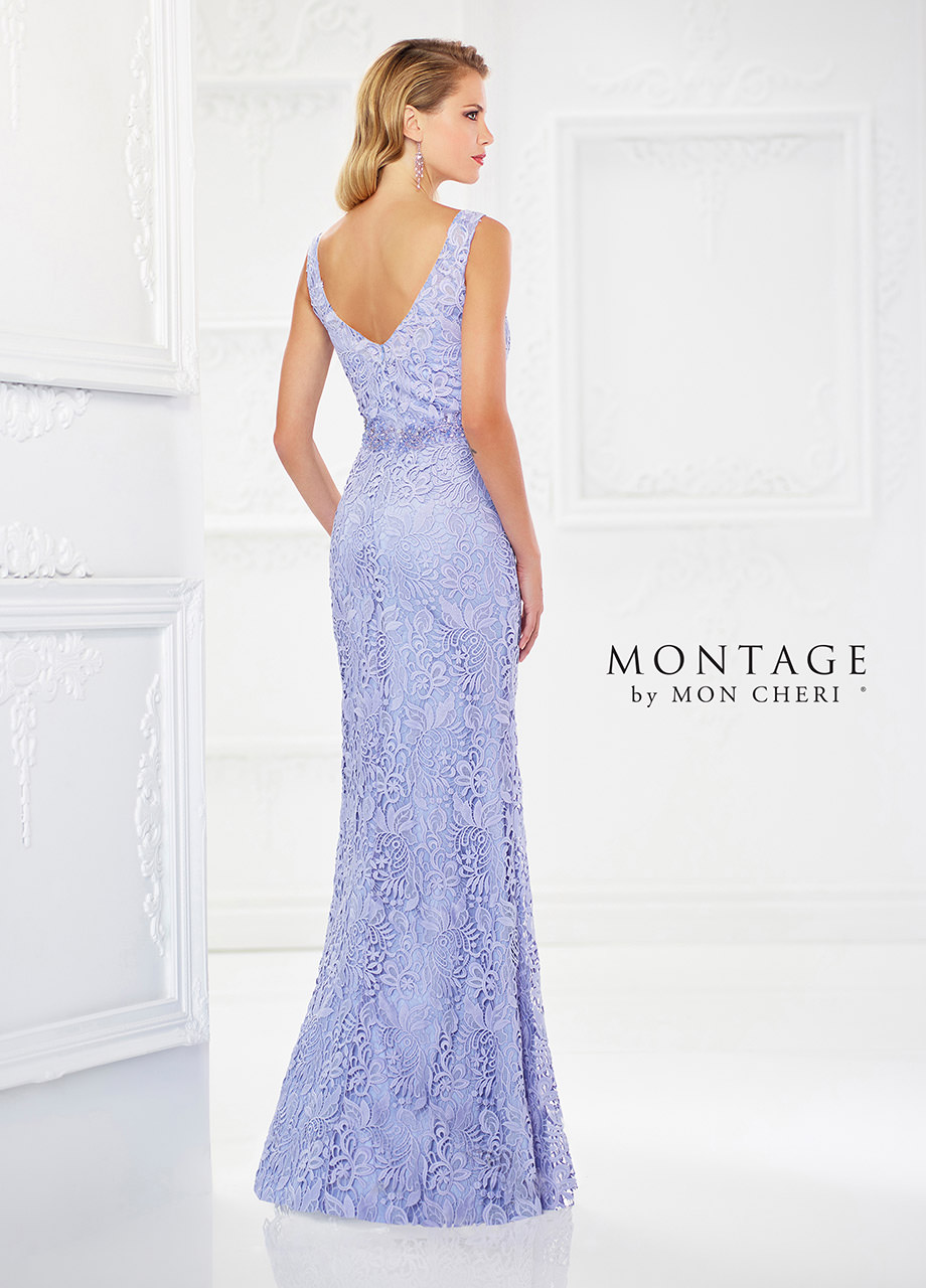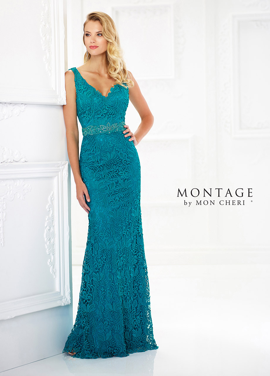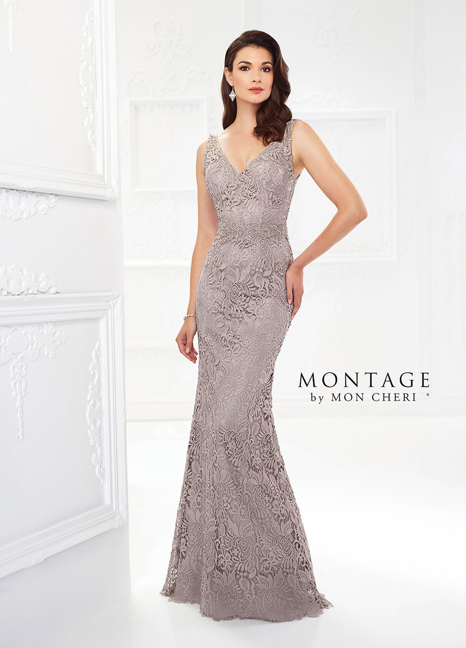 Offering two looks in one, this sleeveless Venise lace fit and flare gown features front and back V-necklines, an intricately beaded natural waist and detachable three-quarter lace illusion sleeves.
