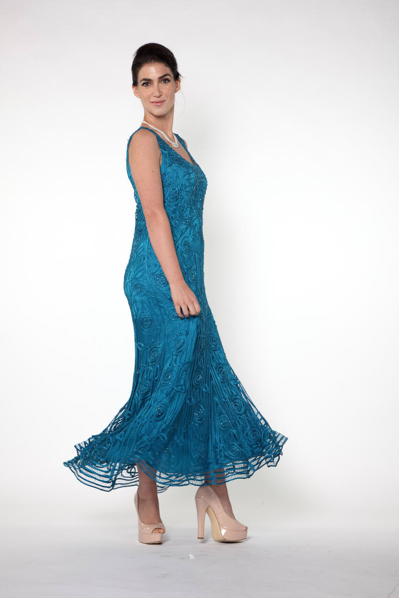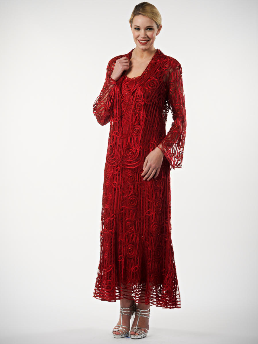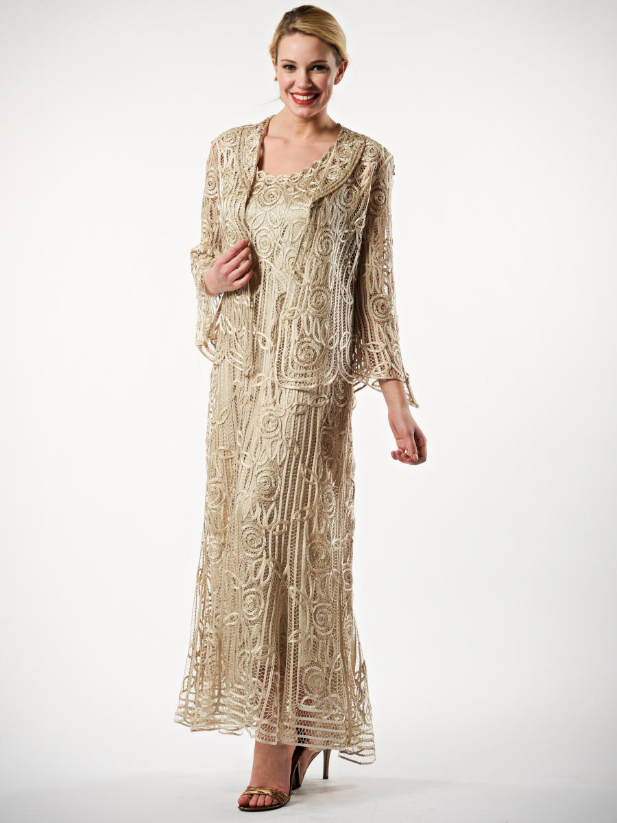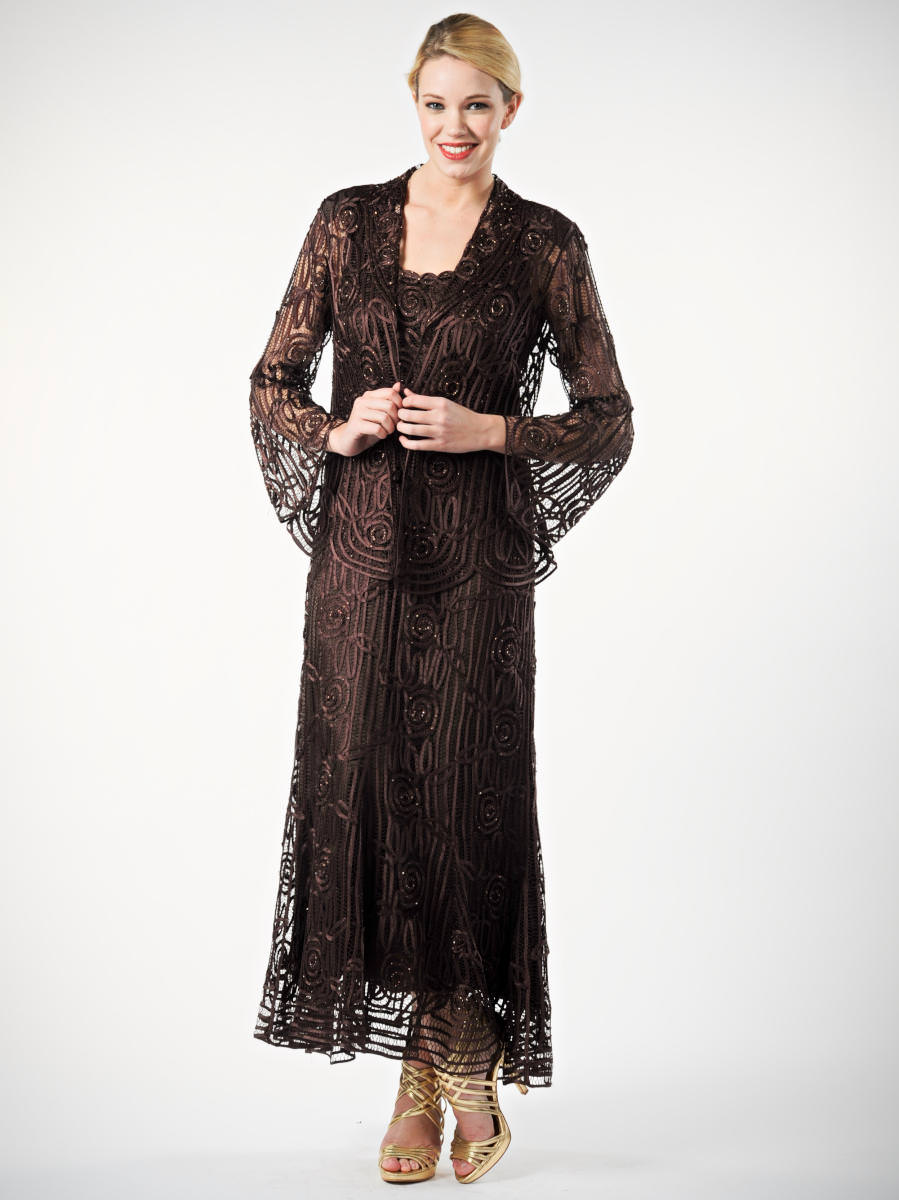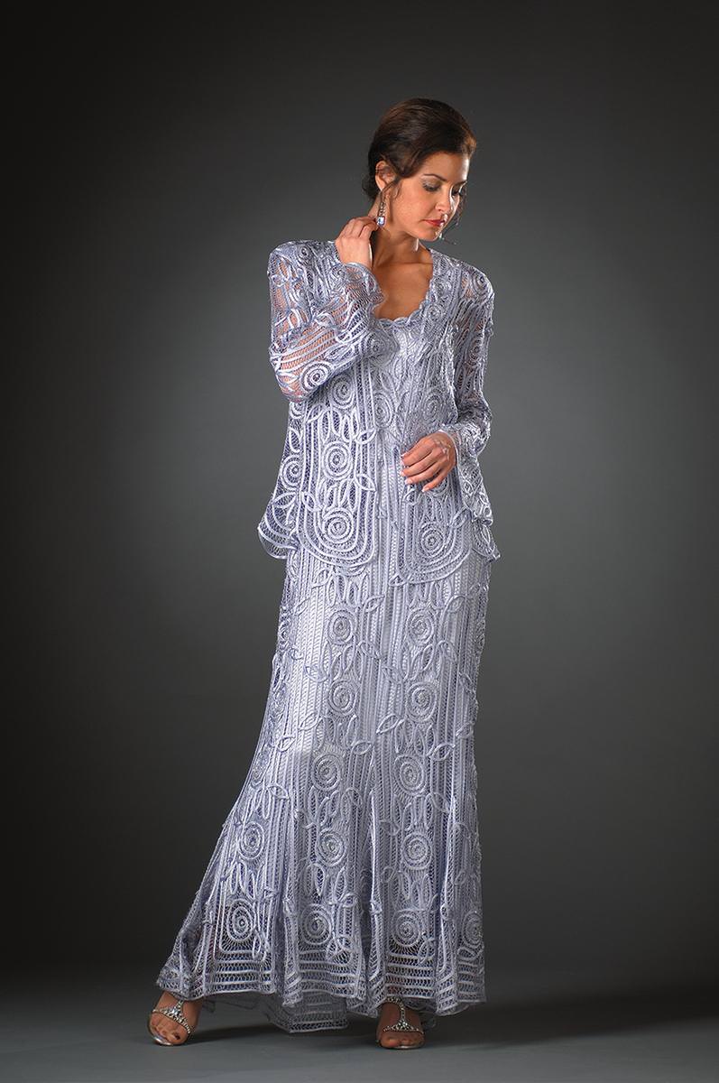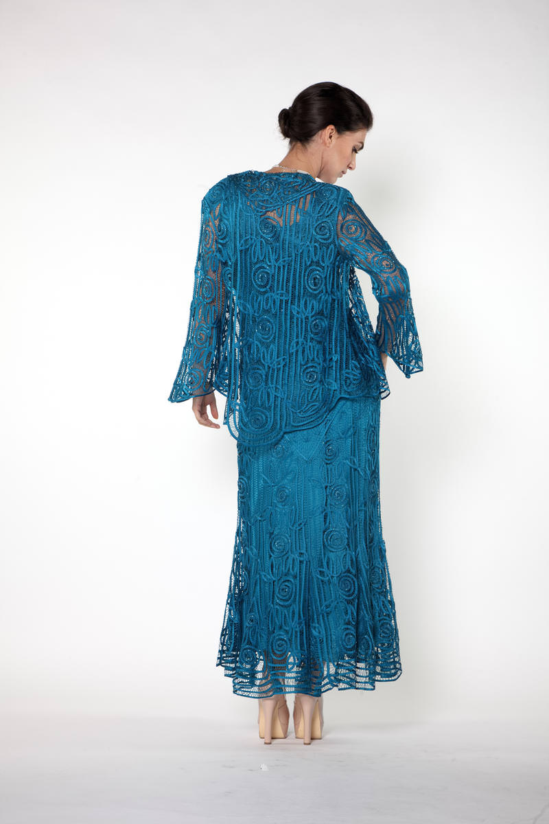 Hand crocheted two piece mother of the bride formal dress consisting of sleeveless dress with matching long sleeve jacket. Plus size evening dress available